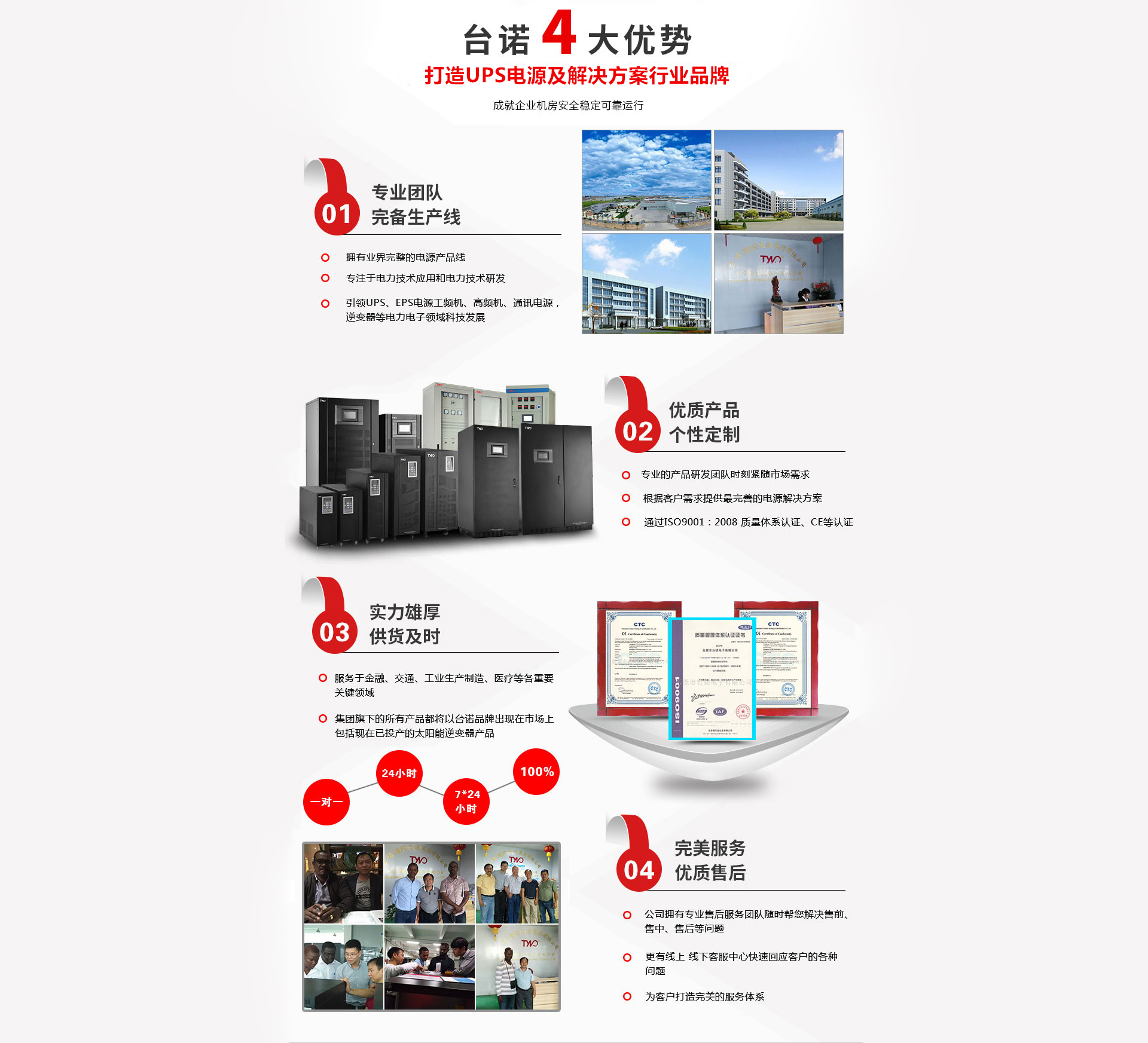 東莞市臺諾電子有限公司是一家以新能源、UPS不間斷電源、EPS應(yīng)急電源、交直流穩(wěn)壓電源、鉛酸免維護(hù)蓄電池、智能變頻電源、智能開關(guān)電源、智能一體化逆變電源、智能電源監(jiān)控系統(tǒng)的研究、開發(fā)、生產(chǎn)、經(jīng)營、銷售及技術(shù)推廣等多行業(yè)發(fā)展高新企業(yè)。公司位于東莞市毗鄰中國南方經(jīng)濟(jì)重地廣州、深圳,交通發(fā)達(dá),信息暢通。系廣東重點高新技術(shù)企業(yè)、東莞市創(chuàng)新型企業(yè)、也是中國電源協(xié)會、廣東省材料與器件產(chǎn)業(yè)技術(shù)創(chuàng)新戰(zhàn)略聯(lián)盟、 東莞市臺諾電子有限公司隸屬于臺諾集團(tuán),是一家有多年UPS集設(shè)計研發(fā)、生產(chǎn)銷售、售后服務(wù)為一體的公司,擁有業(yè)界完整的電源產(chǎn)品線,專注于電力技術(shù)應(yīng)用和電力技術(shù)研發(fā)。公司致力于向全球客戶提供性能好、品質(zhì)好的產(chǎn)品與服務(wù)。UPS、EPS電源工頻機(jī)、高頻機(jī)、通訊電源、光伏、逆變器等電力電子領(lǐng)域科技發(fā)展,創(chuàng)造可靠、節(jié)能的產(chǎn)品,致力于為客戶提供完善的電源解決方案。產(chǎn)品廣泛應(yīng)用于政府、金融、通信、教育、交通、氣象、廣播電視、工商...